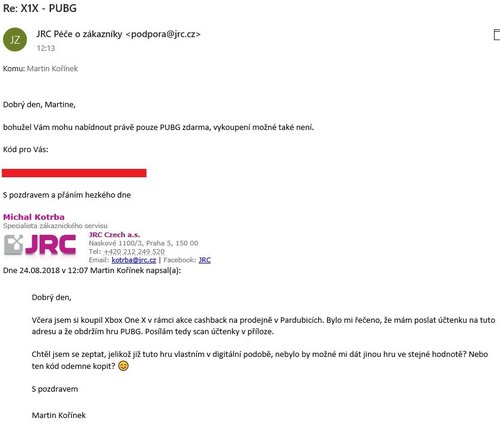 11. Dobrý den, nabízím k prodeji kód pro hru Playeruknown´s Battleground. Dostal jsem ho ke koupi X1X nicméně tuto hru už mám. Pošlu mailem po důkazu zaslání peněz nebo se můžeme sejít v Pardubicích a kód si zadáte do mobilní aplikace a pak zaplatíte, až si ověříte platnost. Jako důkaz přikládám screenshot mailu z JRC. Cena 300,-