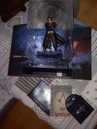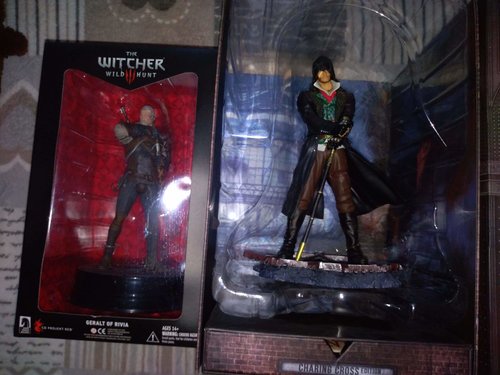 Assassin's Creed Syndicate figurka, mapa Londýna, CD se soundtrackem a Artbook Witcher 3 Wild Hunt figurka Top stav, pouze rozbaleno.