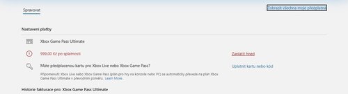 5. Doběhla mě platnost Xbox Game Pass Ultimate a nechci s tímto předplatným již pokračovat.Místo toho jsem zakoupil kód Xbox Live Gold,ten mě ale nejde vložit a hlásí to Platební metoda u existujícího předplatného byla odmítnuta a blokuje tento nákup. Na svém Xboxu přejděte do Nastavení. Nebo přejděte na web account.microsoft.com/services a tam tento problém vyřešte. Může mě někdo prosím pomoci jak postupovat ? To předchozí předplatné Ultimate po mě stále chce peníze pro pokračování a nikde se mě nedaří najít jak to úplně zrušit. děkuji