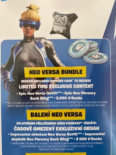 7. Zdravím, Prodám Fortnite Epic Neo Versa Bundle + 2000 V-Bucks PSN klíč. Obsahuje obleček + další věci a 2000 V-Bucks. Cena 350Kč